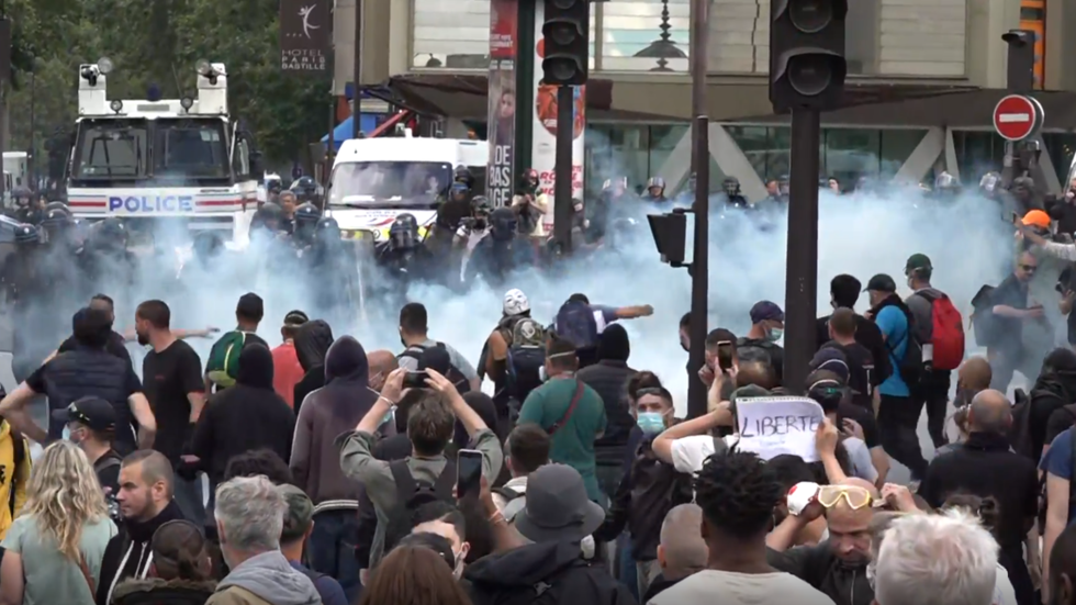 Trei ofițeri au fost răniți în timp ce protestele în masă la Paris împotriva unui „permis sanitar” Covid-19 s-au revărsat în ciocniri acerbe între manifestanți și poliție, în timp ce mii au ieșit pe străzile Franței pentru un al treilea weekend consecutiv.