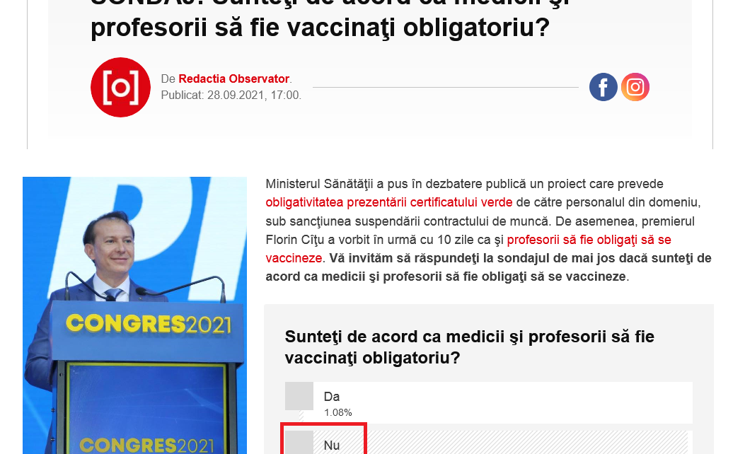 Ministerul Sănătății a pus în dezbatere publică un proiect care prevede obligativitatea prezentării „certificatului verde” de către personalul din domeniu, sub sancțiunea suspendării contractului de muncă. De asemenea, premierul Florin Cîțu a afirmat ca și profesorii să fie obligați să se vaccineze. Inițiativa în sine este anti-constituțională, fapt ce nu pare să deranjeze guvernanții actuali. Observator News a invitat românii să se pronunțe dacă sunt de acord ca medicii și profesorii să fie obligați să se vaccineze, într-un sondaj acum încheiat. Au răspuns câteva zeci de mii de români. Rezultatul, de ținut minte, în infografia de mai sus: 98,92% spun NU vaccinării obligatorii a medicilor și profesorilor.