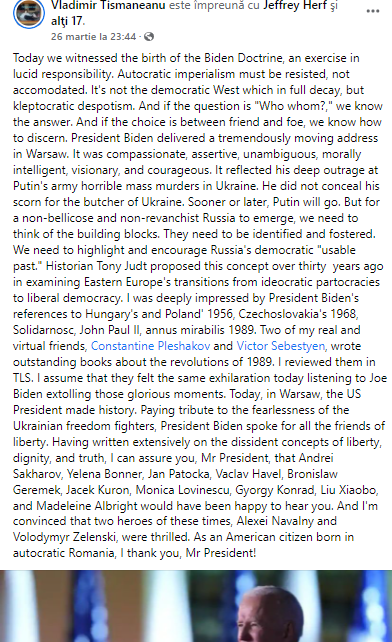 În prima parte aflăm că discursul lui Biden de la Varșovia constituie nașterea „Doctrinei Biden”. Cum altfel – doctrina și drezina. În partea a doua a textului aflăm, ca de obicei, cine sunt câțiva dintre prietenii lustragiului, ce cărți au scris etc. Apoi lustragiul se recomandă președintelui american drept „un cetățean american născut în România autocratică.”