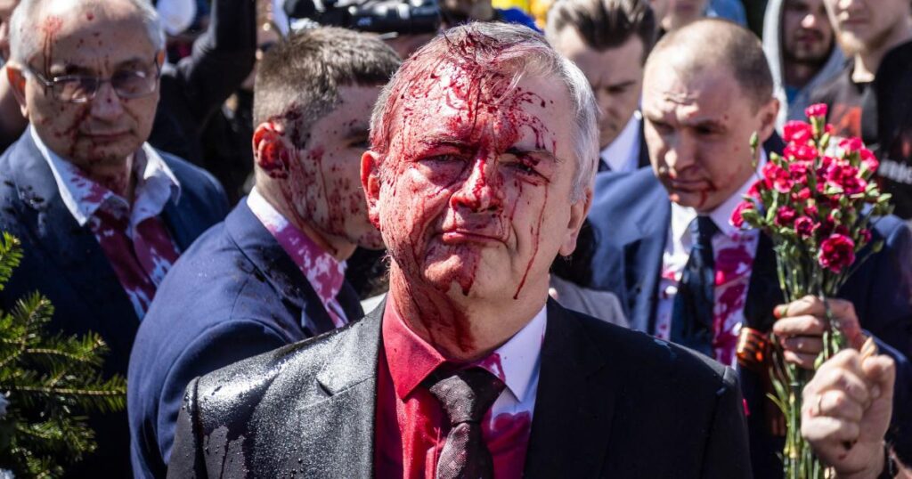 Ambasadorul Rusiei în Polonia, Serghei Andreev, a fost stropit luni cu o substanță roșie de manifestanți pro-ucraineni, la o ceremonie de la Varșovia în cadrul căreia a dorit să marcheze împlinirea a 77 de ani de la victoria URSS, SUA și a aliaților europeni împotriva Germaniei naziste în cel de-al doilea Război Mondial, relatează AFP, citată de Agerpres. Nu pare a fi vorba de o substanță toxică deoarece atât el, cât și persoanele din jurul său – inclusiv unii dintre protestatari – care au fost atinse pe piele de lichidul roșu nu au pățit nimic, după cum se observă din filmările de la fața locului. VIDEO: