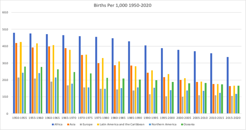 Cu toate acestea, chiar dacă Africa menține o rată ridicată a natalității de câteva decenii, acest lucru nu va fi suficient pentru modifica efectul cumulat la nivel global al numărului scăzut de nașteri. Conform Băncii Mondiale, rata de fertilitate la nivel mondial în 2019 era 2,403. Anticipez, pe baza cercetărilor recente, că rata de fertilitate la nivel mondial va atinge pragul-cheie de 2,1 în jurul anului 2030.