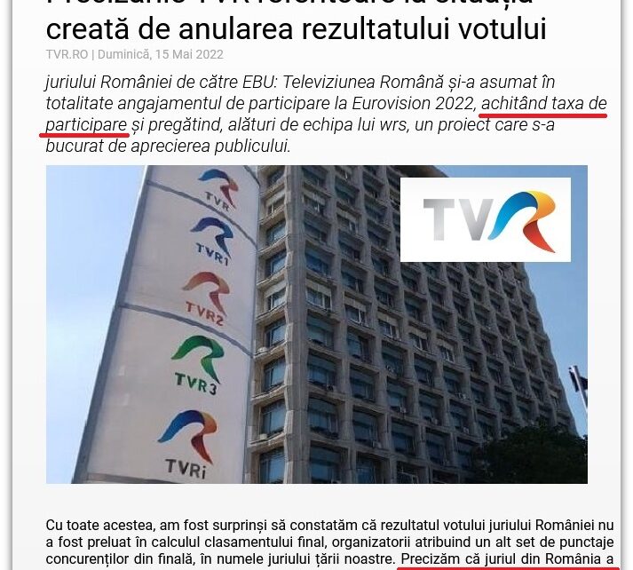 „TVR acuză organizatorul Eurovision că a modificat rezultatul votului dat de juriul românesc, oferind punctaje diferite concurenților din finală. Potrivit unui comunicat transmis de TVR, juriul românesc acordase punctaj maxim echipei care a reprezentat Republica Moldova, însă EBU ar fi decis să acorde punctele Ucrainei.”