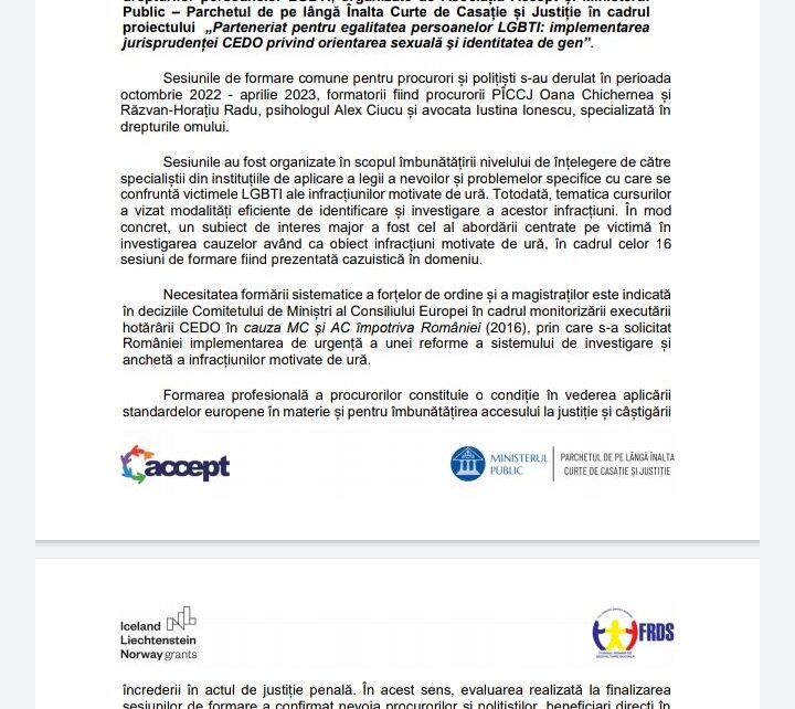 Sesiunile au fost organizate de Asociația Accept și Parchetul de pe lângă Înalta Curte de Casație și Justiție, în cadrul proiectului „Parteneriat pentru egalitatea persoanelor LGBTI: implementarea jurisprudenței CEDO privind orientarea sexuală și identitatea de gen”.
